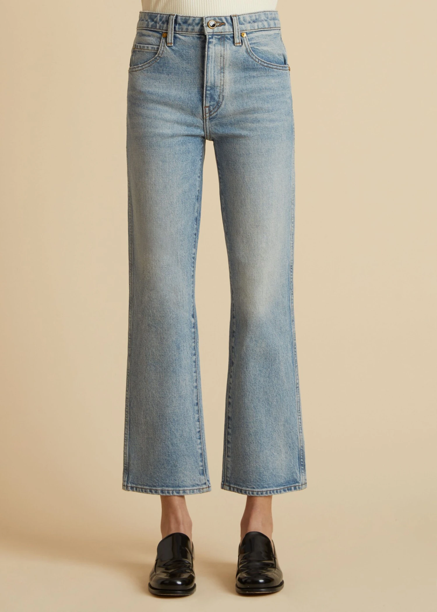 With the hint of a flare accentuating its slightly cropped silhouette, this high-rise style in a pale vintage wash is a fresh and flexible interpretation of the classic bootcut fit, with back patch pockets placed to flatter the feminine form and marigold topstitching. Each hand-finished pair has an enameled button of antiqued brass.